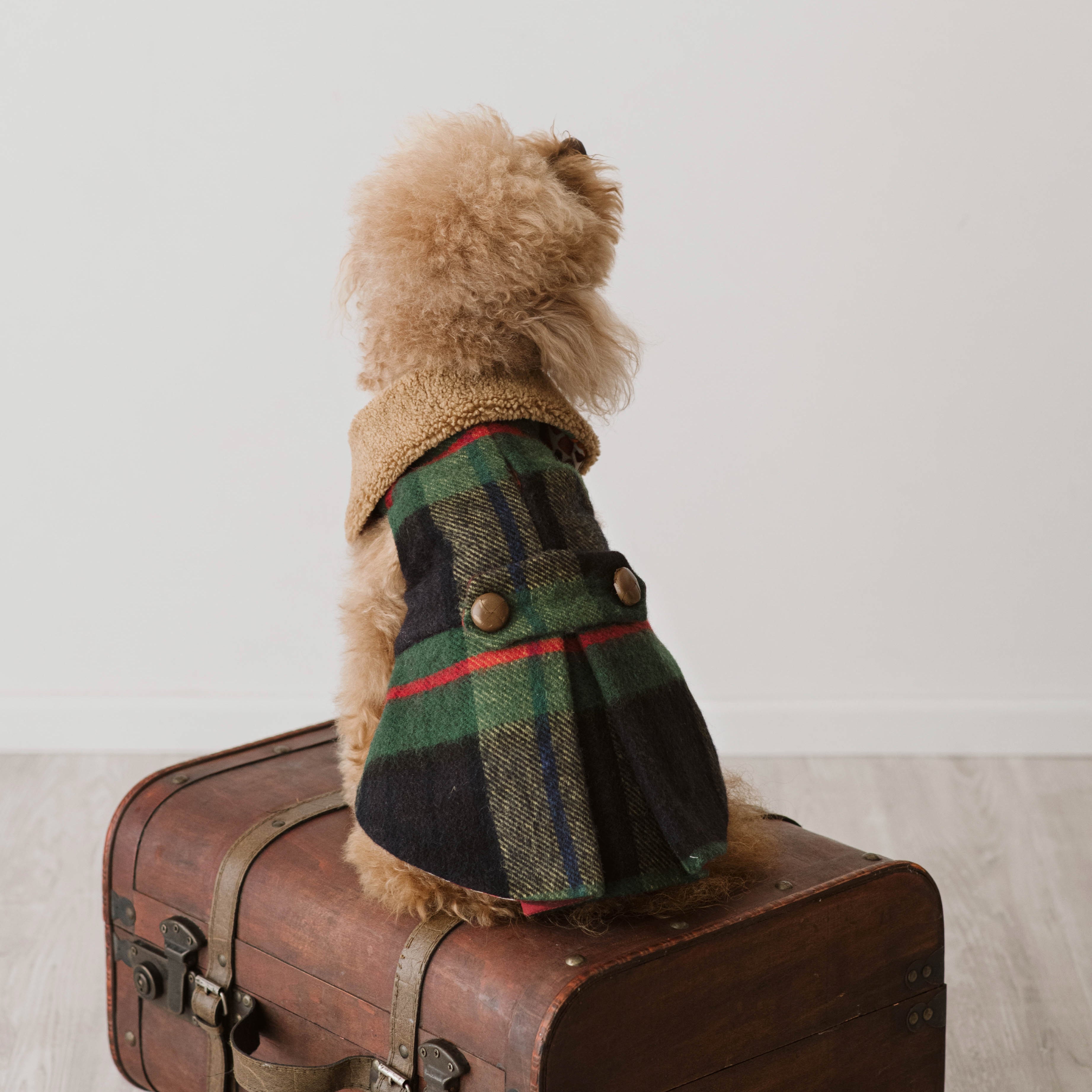 Realizzato in pregiata lana con motivo tartan, questo cappotto per cani unisce tradizione e raffinatezza, richiamando l’eleganza del design britannico. Ideale per la stagione invernale, è perfetto per barboncini e cani di piccola taglia che cercano un look ricercato durante le passeggiate nei mesi freddi.